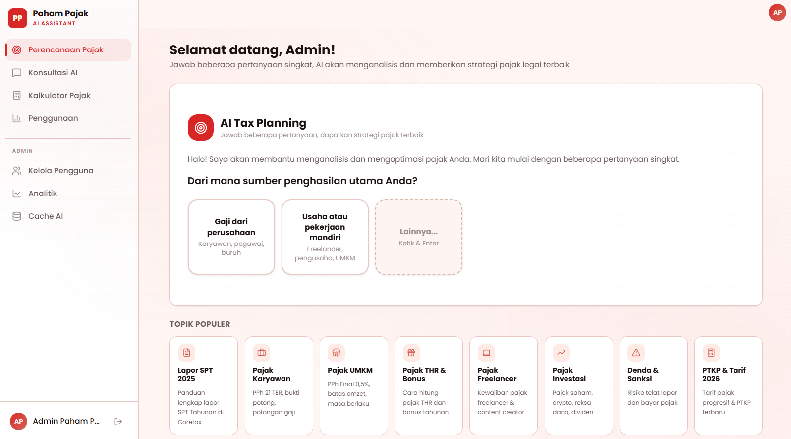 An advanced Indonesian tax consultation platform featuring an AI advisor powered by Google Gemini and RAG. Tightly integrated with 7 robust tax calculators and a real-time analytics dashboard, Paham Pajak simplifies complex financial regulations through an intuitive, data-driven architecture.